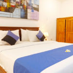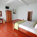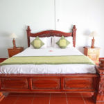 Villa Abimanyu III have 3 bedrooms. The 1st bedroom is located in the ground level, furnished with air-conditioning, queen-sized bed, white clean ceramic floor, bedside tables with lamps, wooden cabinet, table with chair and dressing mirror. The bathroom have bath-tub with hot & cold water shower, wash basin and wooden-framed dressing mirror.
