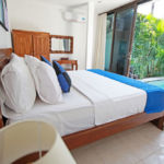 The 3rd bedroom is overlooking the swimming pool, offering queen-sized bed, air-conditioning, white clean ceramic floor, bedside tables with lamps, wooden table with chair and dressing mirror. The bathroom have rain shower with hot & cold water running, wash basin with dressing mirror.