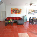 The open-plan living room provides a comfy sofa, flat screen TV with satellite channels and DVD player whilst the fully equipped kitchen and 6 seating dining area are located on the left side of the main pavilion.